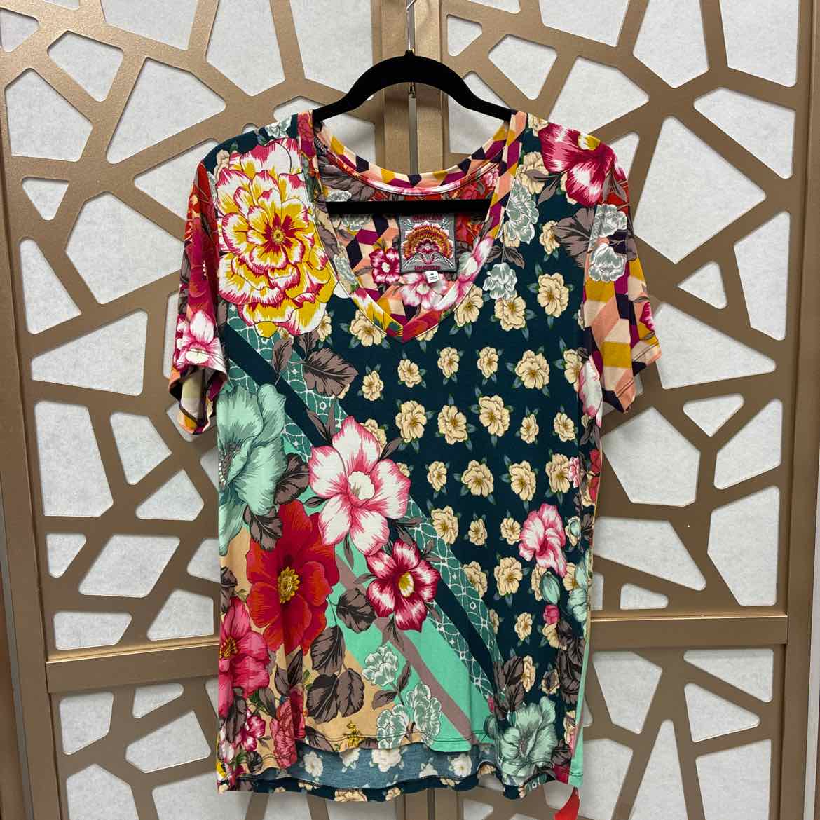 SS, V neck, red/green Lg floral